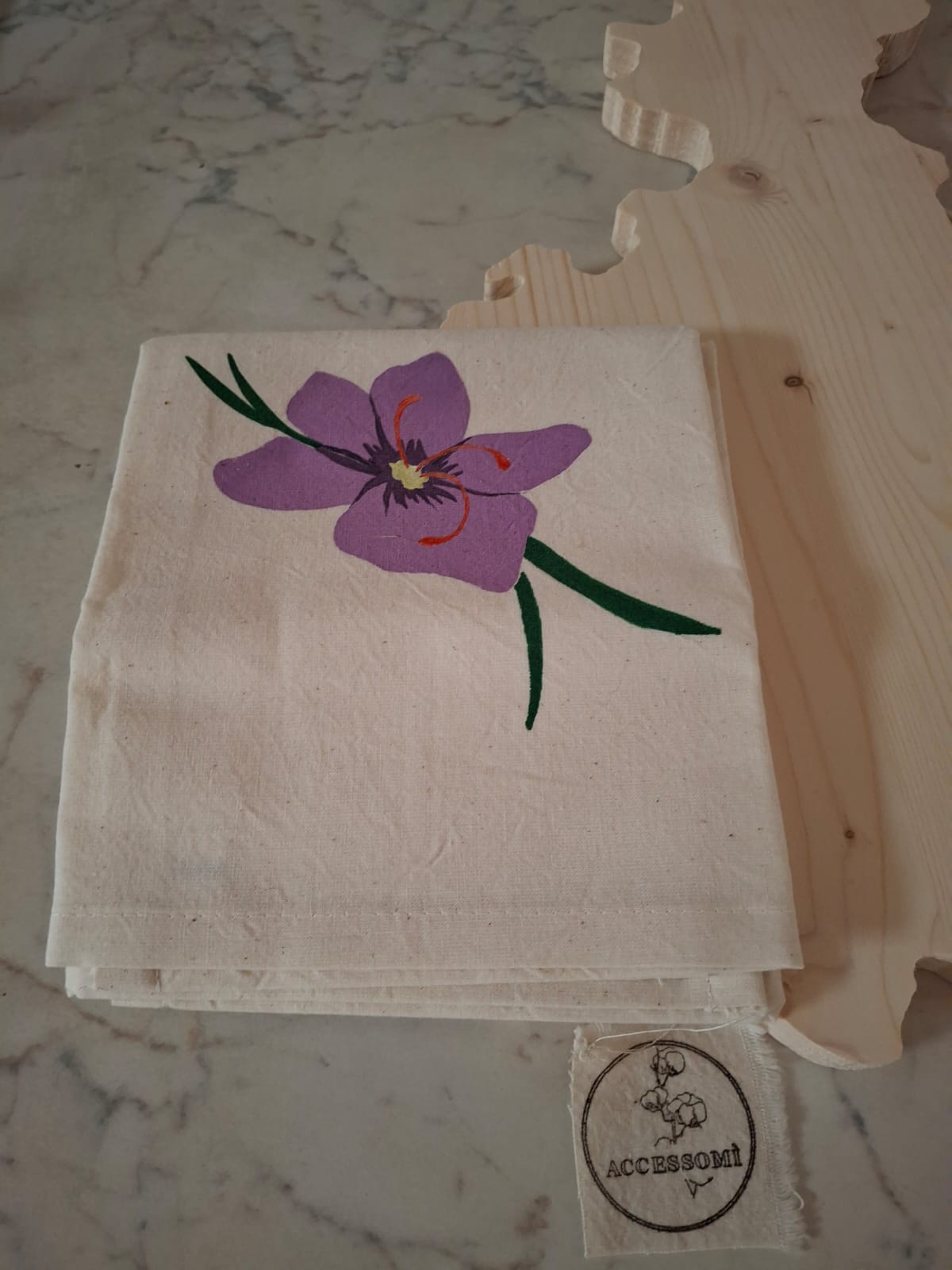 Realizzato in tessuto di cotone naturale e dipinto interamente a mano, questo canovaccio è il dettaglio che porta arte e calore nella tua cucina.